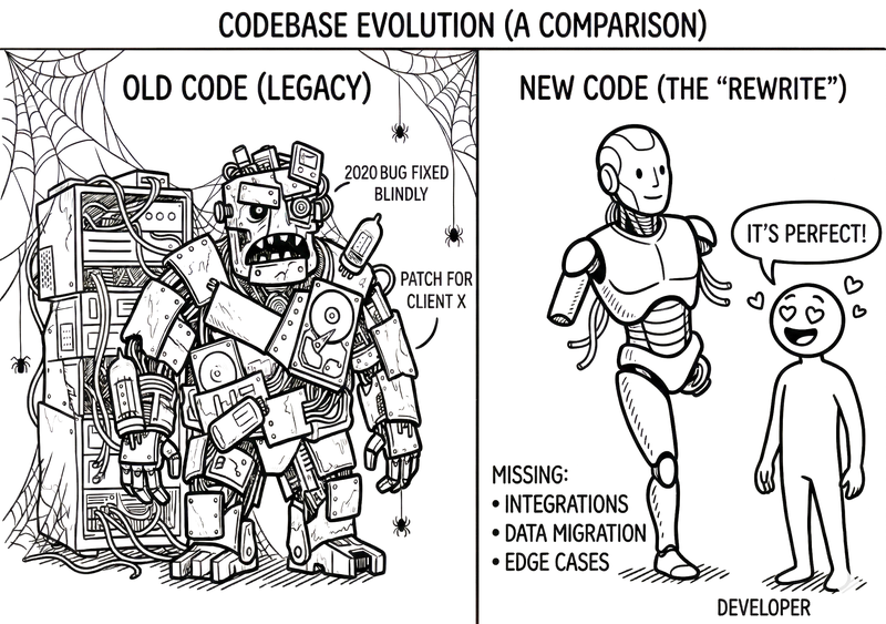 The problem with rewriting from scratch isn’t just technical — it’s deeply human. When you look at old code, you judge it with today’s eyes but yesterday’s memory. You see “bad decisions” where there were actually deadlines, technical constraints, lack of experience, or simply a different context. And above all, you forget that this tangle of code has already survived battles that the new system doesn’t even suspect yet: bugs that were fixed, weird business edge cases, absurd conditions from big clients that ended up embedded in some stray if statement.